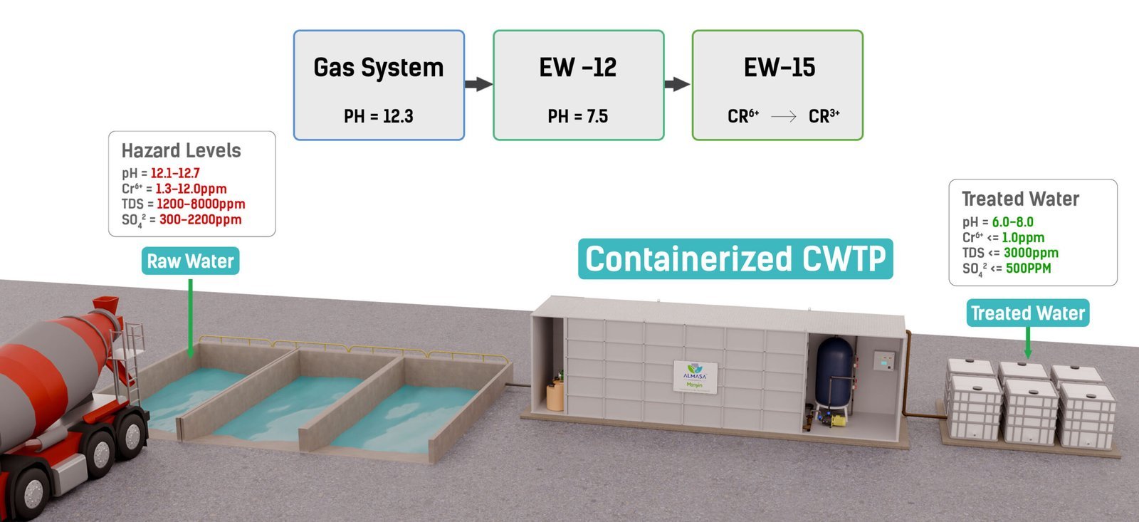 The Concrete wastewater produced from cement manufacturing, block factories, and precast factories is characterized not only by its high pH value but also by its contamination with high levels of chromium and Total Dissolved Solids (TDS). These characteristics pose significant environmental and health risks, necessitating careful treatment before discharge or reuse.