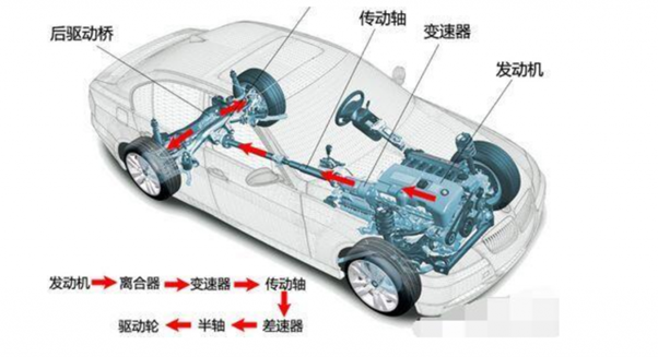 Power flows from Engine -> Clutch -> Gearbox -> Propeller Shaft -> Differential -> Half Shaft -> Wheels.